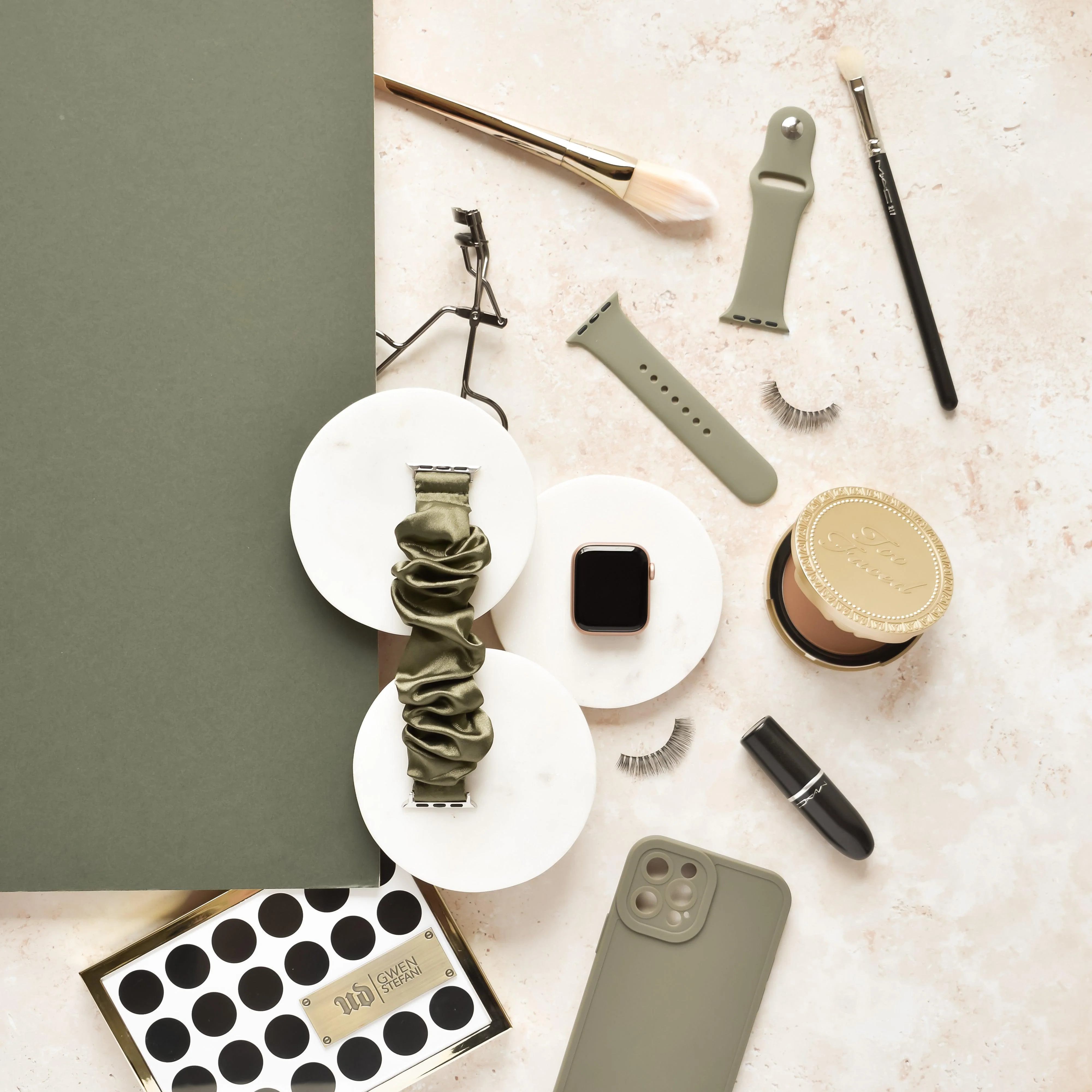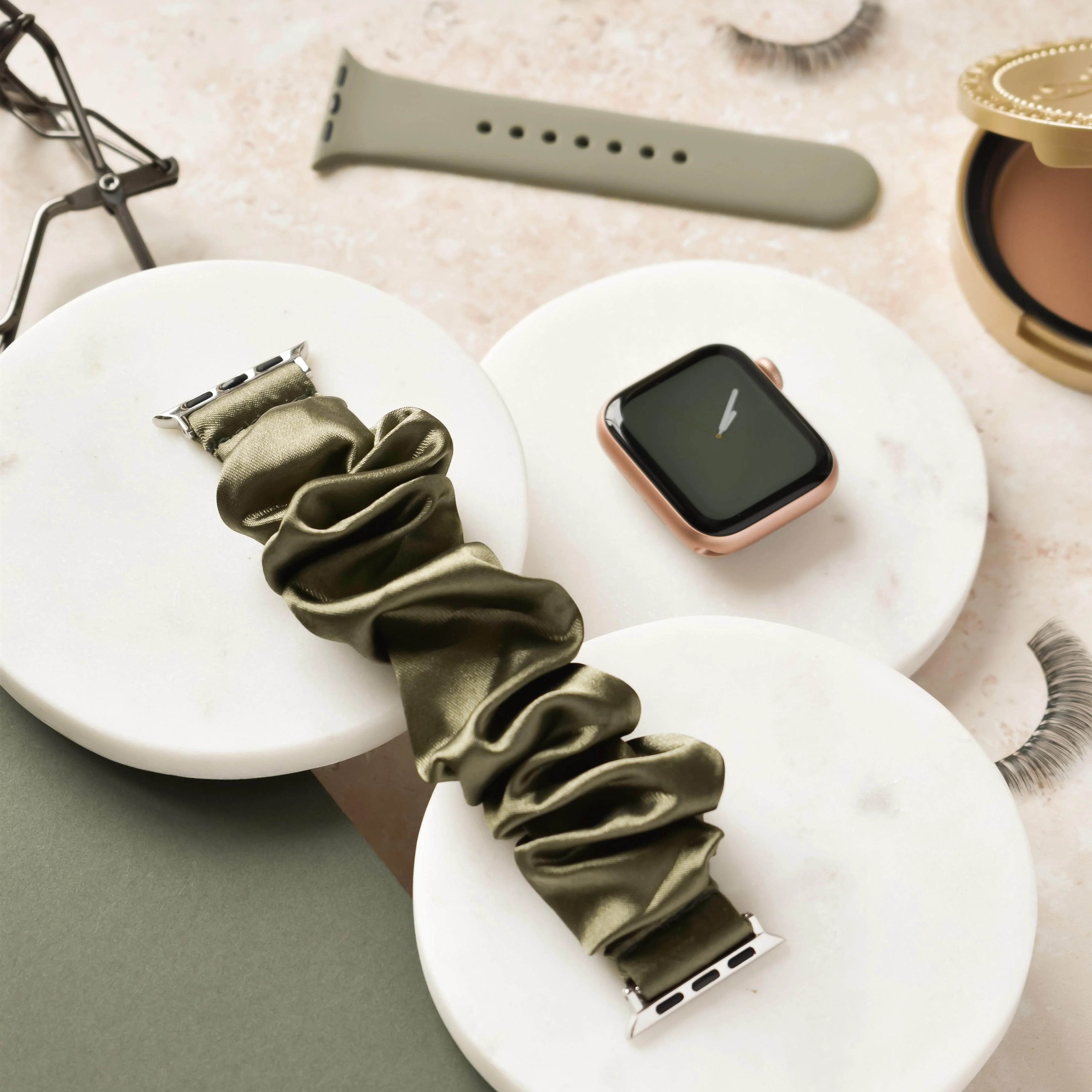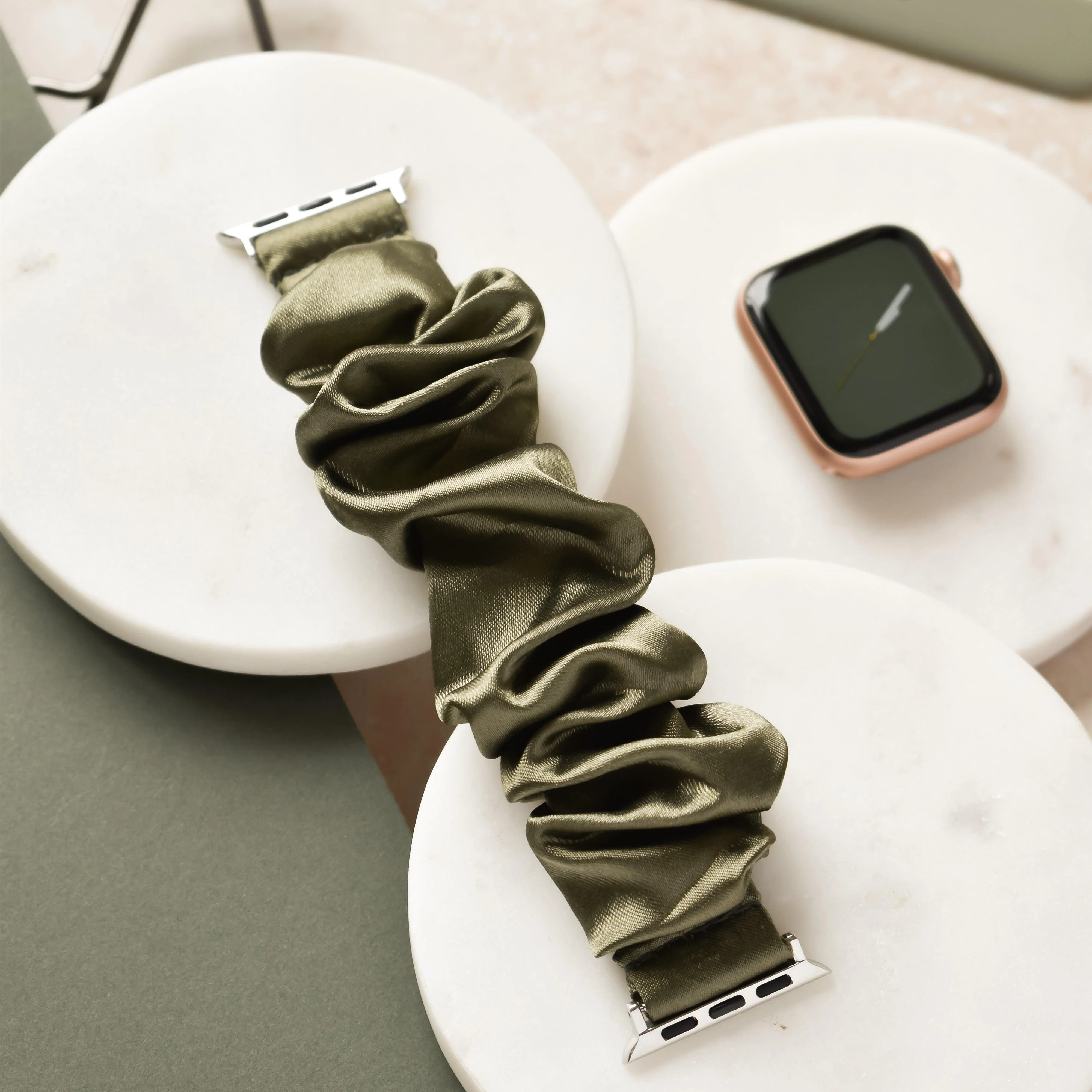 Say hello to our Vintage Khaki Apple Watch Strap in a unique Scrunchie wrist band design. This silky satin will bring timeless comfort and a sprinkle of understated glam to your every day.